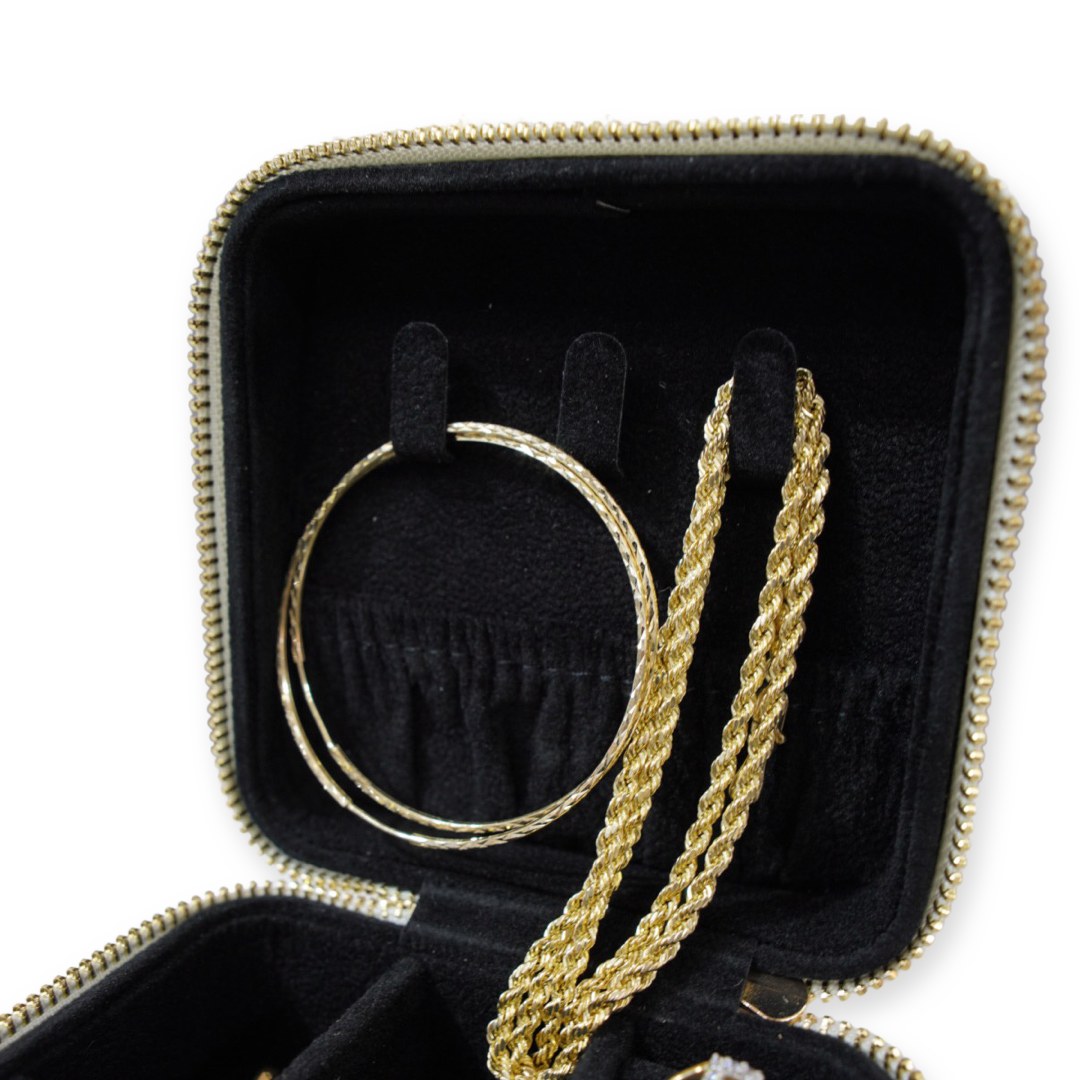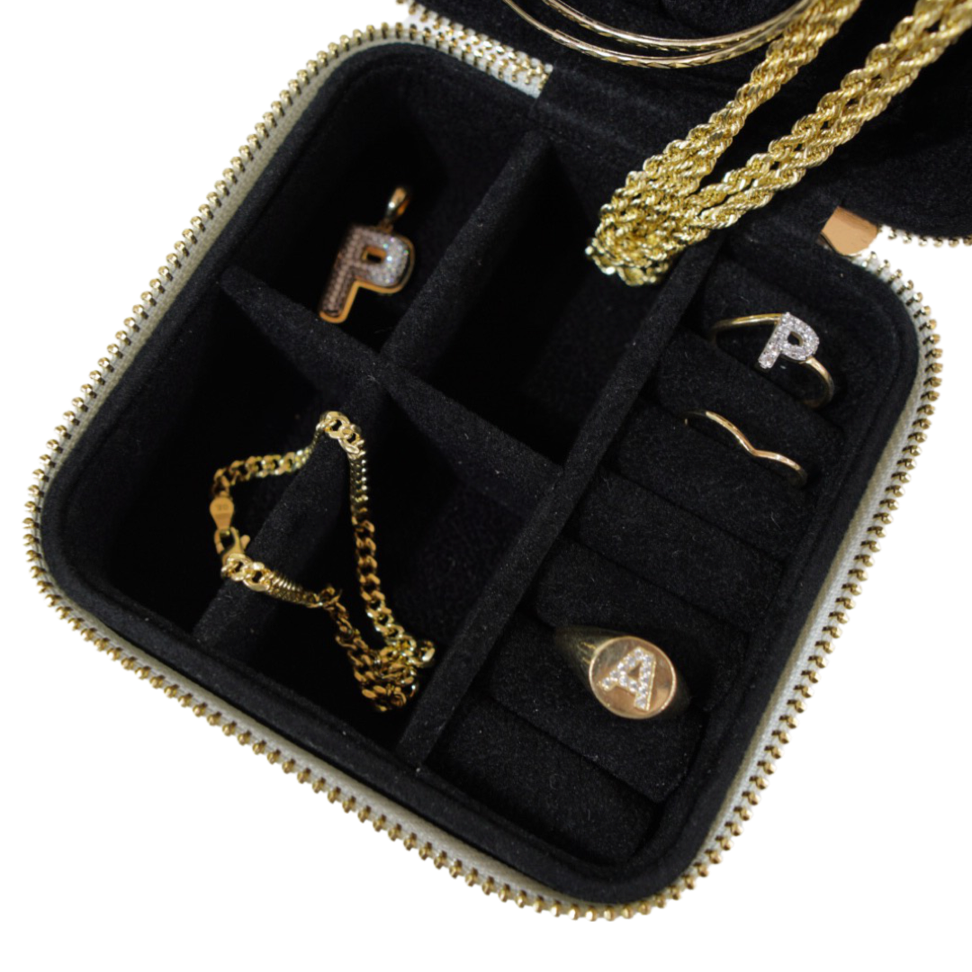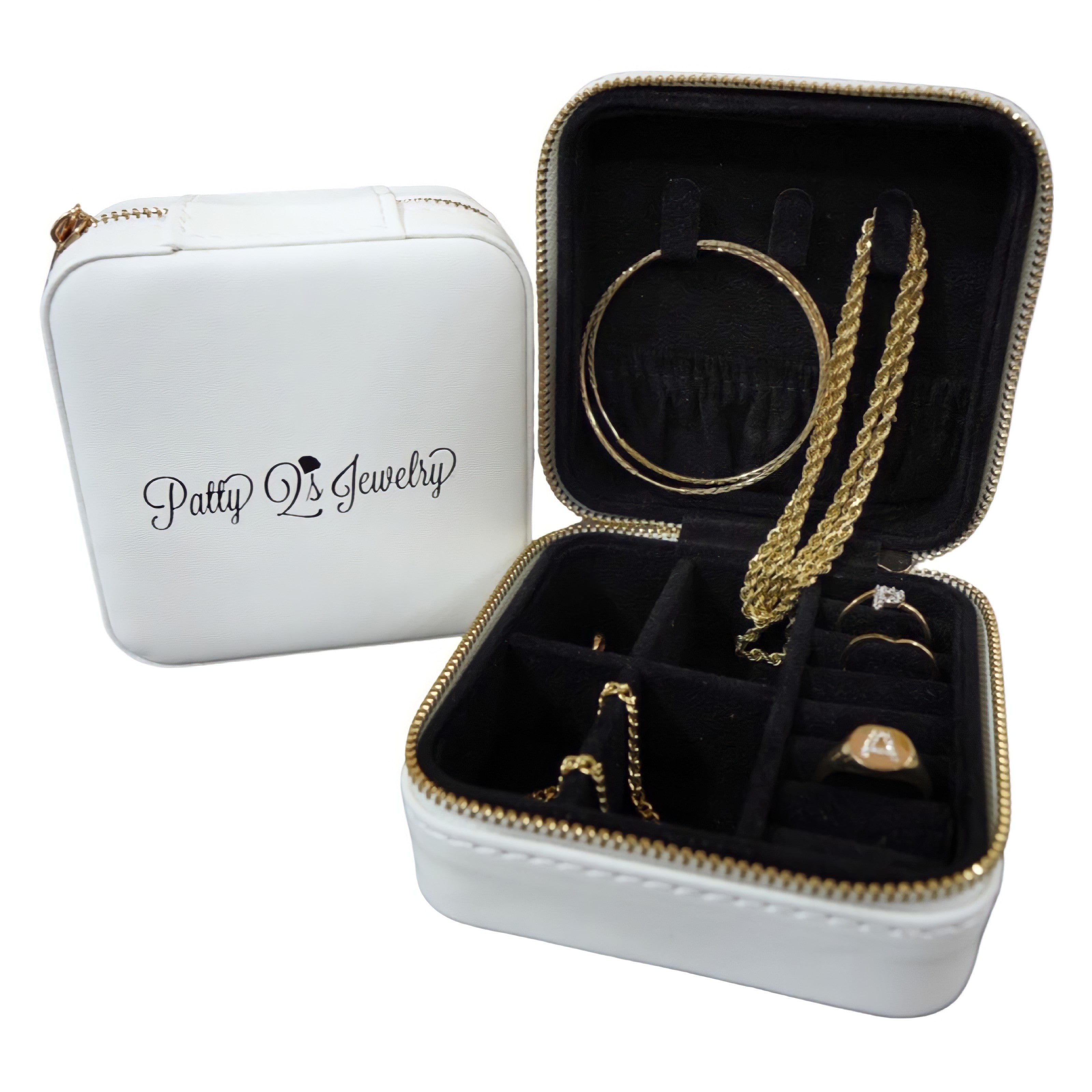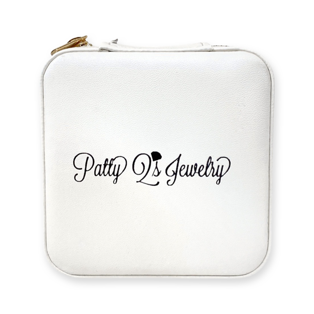 Our first ever luxurious faux white leather jewelry travel case with a black velvet interior to keep your favorite PQJ pieces with you on the go, or stored away safely at your home.