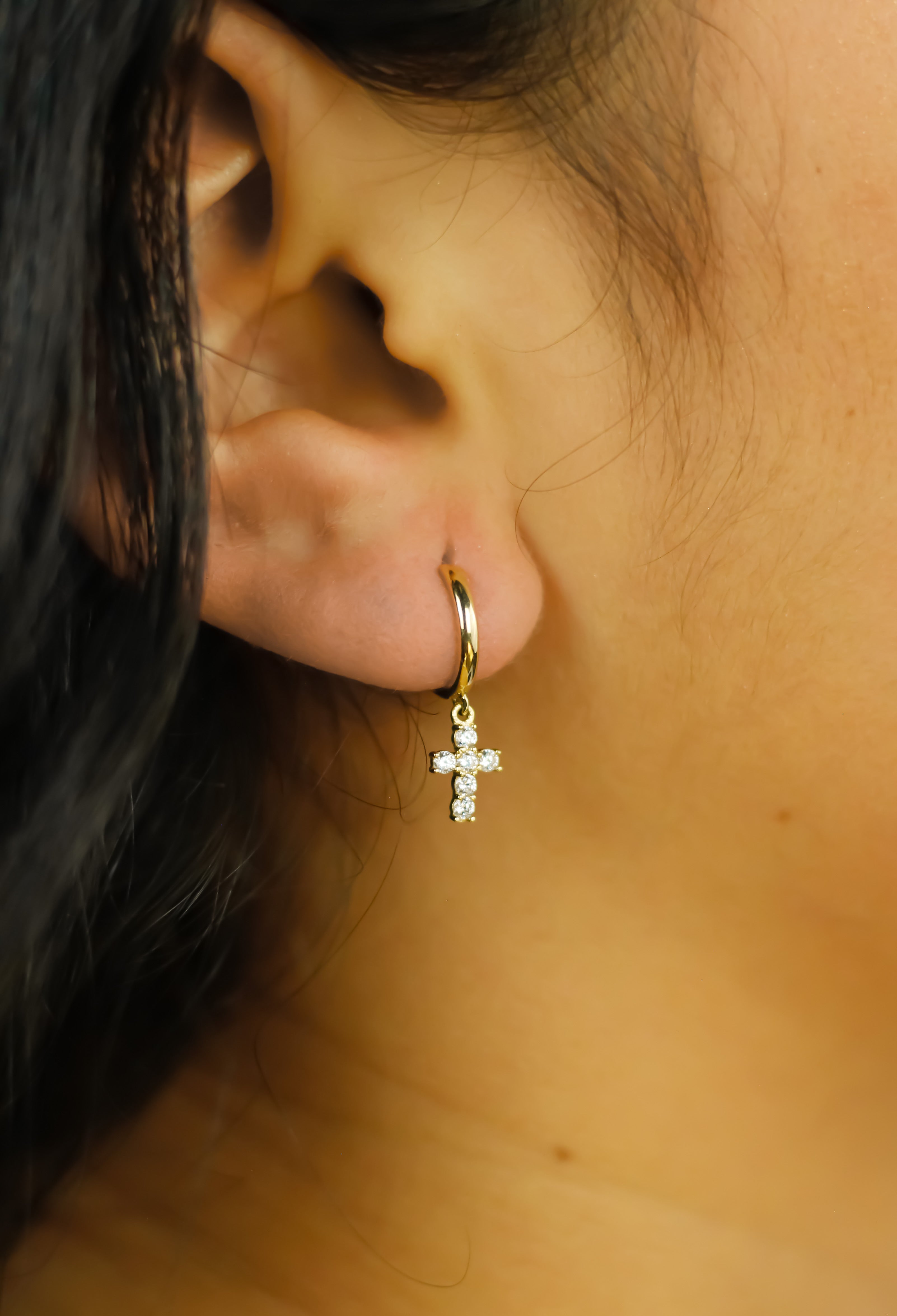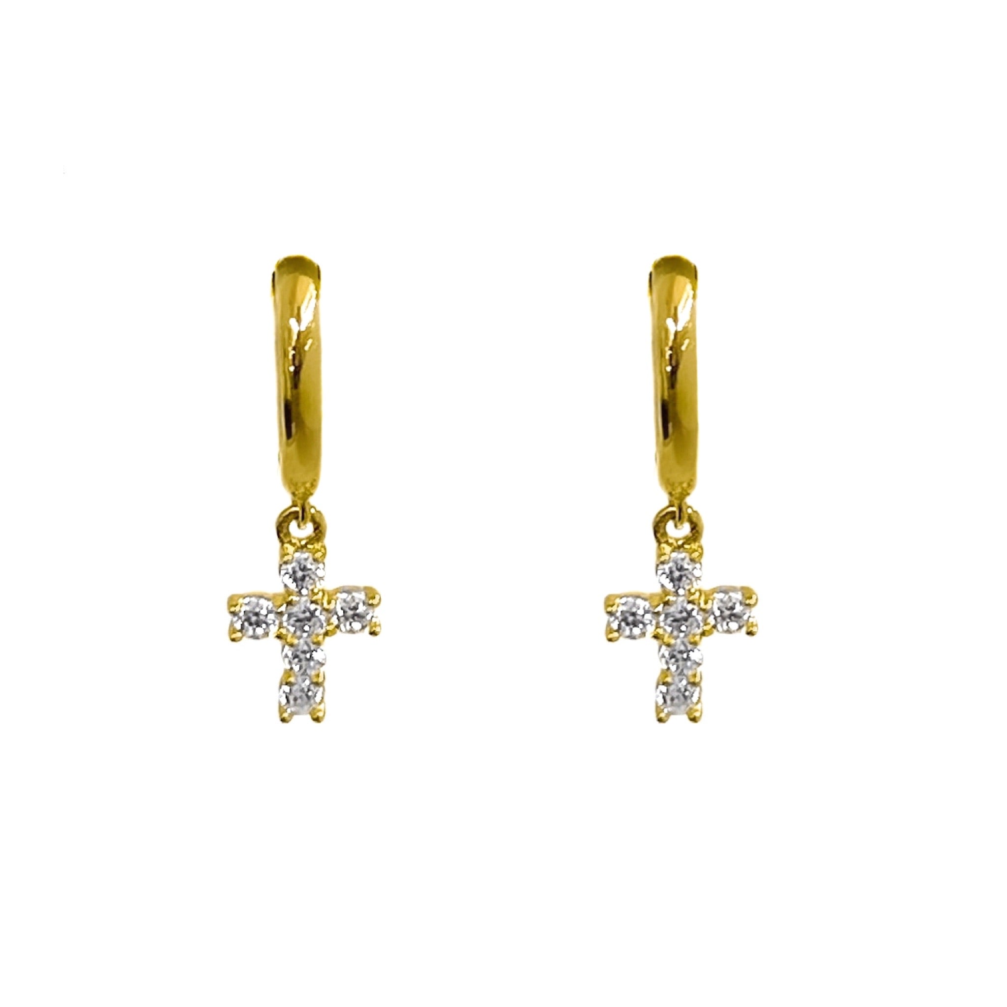 - 14K YELLOW GOLD MINI CZ CROSS HOOPS