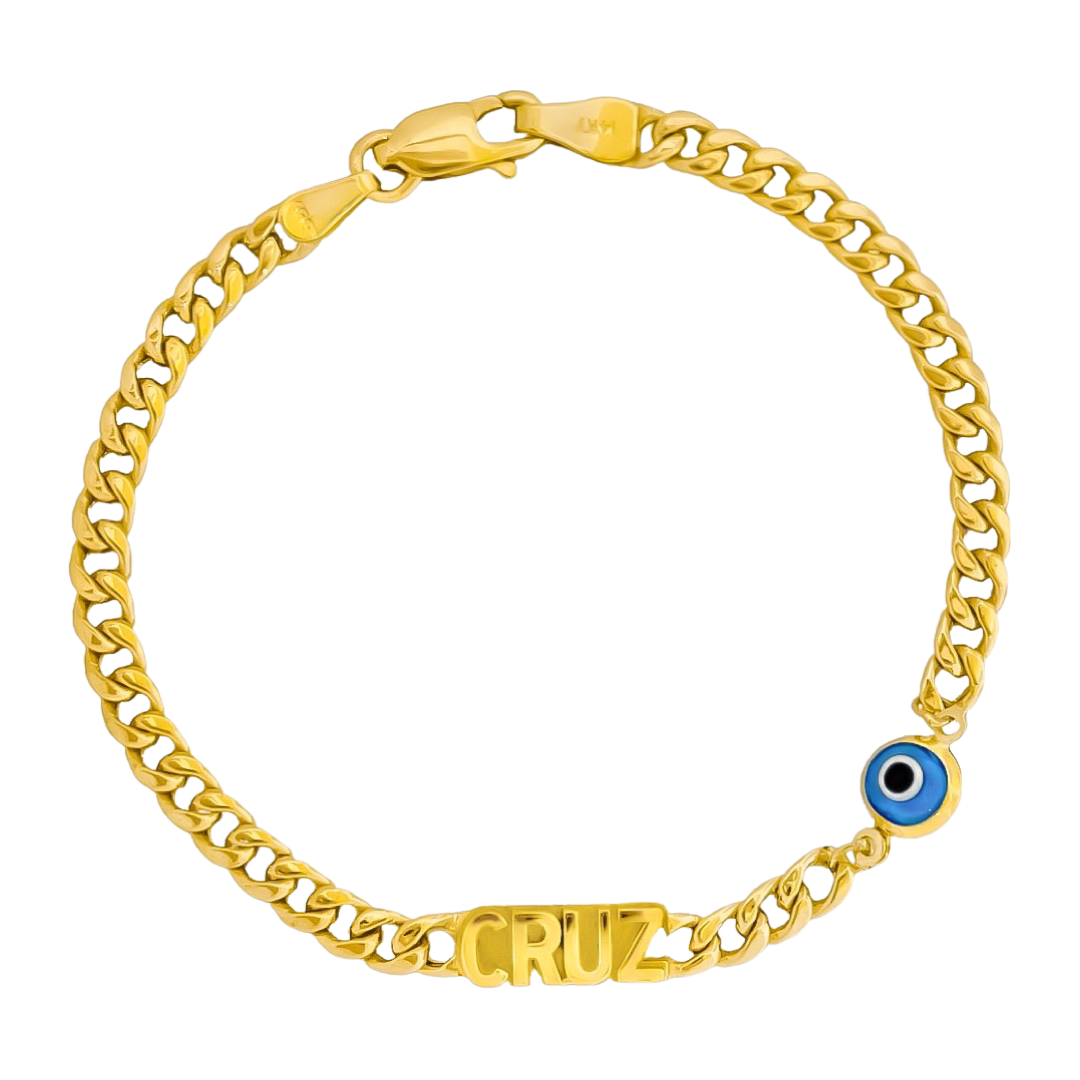 14K YELLOW GOLD MIAMI CUBAN NAME IN-LINK EVIL EYE BRACELET -3MM