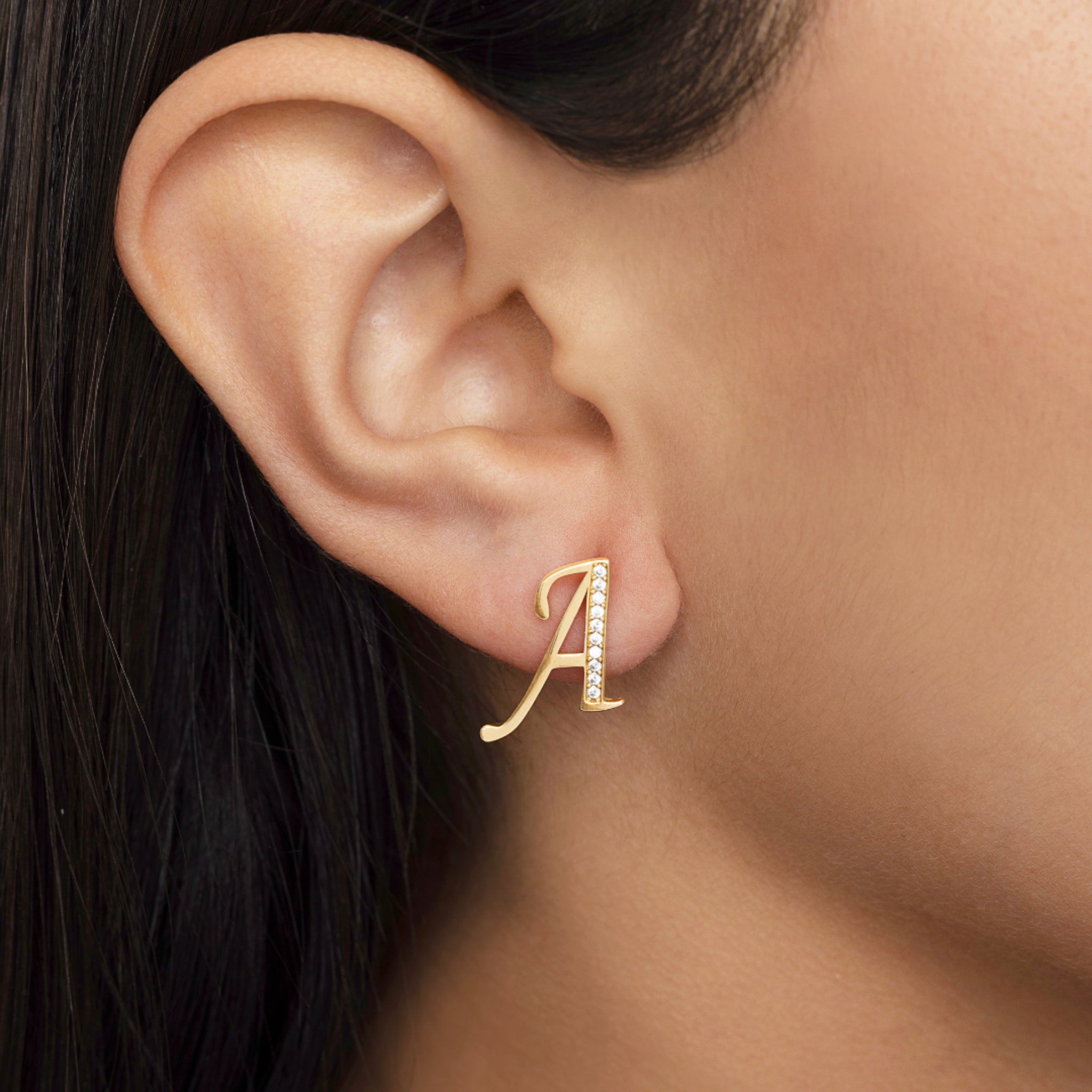 10K YELLOW GOLD PAVE ACCENT SCRIPT INITIAL STUD EARRINGS