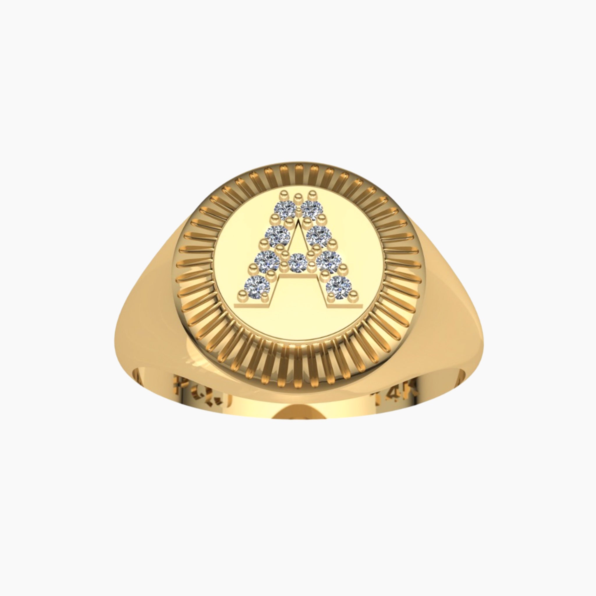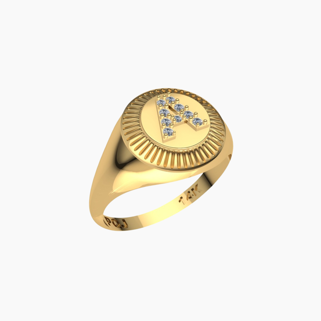 14K YELLOW GOLD ROUND AURA DIAMOND INITIAL SIGNET RING