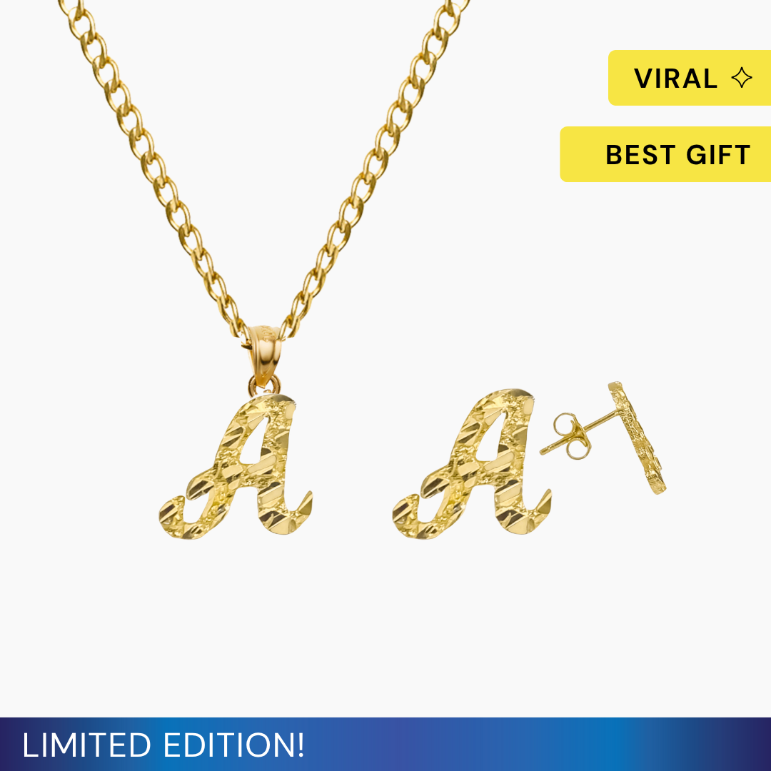 10K YELLOW GOLD MAIN CHARACTER NUGGET INITIAL NECKLACE + EARRINGS GIFT SET