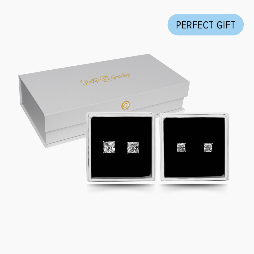 A limited-edition set featuring 2 pairs of 925 Sterling Silver Princess Cut Cubic Zirconia Studs. Effortlessly elegant. Comes in our luxurious gift packaging.