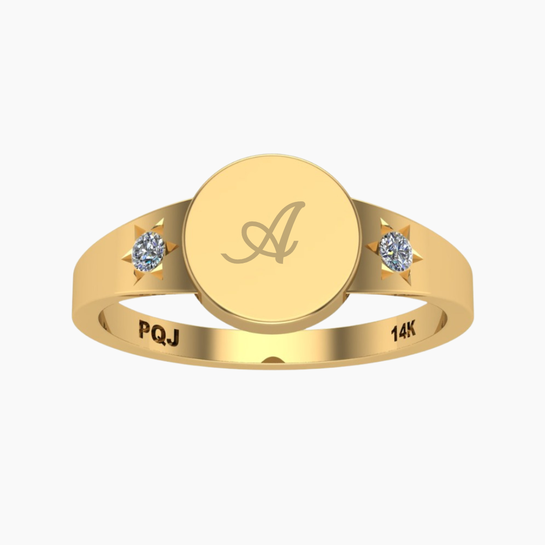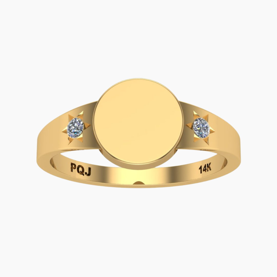 14K YELLOW GOLD ROUND SIGNET STARBURST DIAMOND RING -ENGRAVABLE
