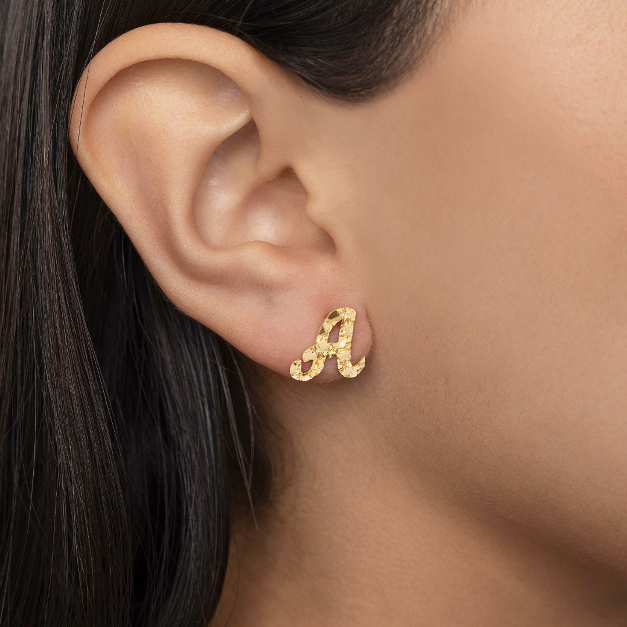 - 10K YELLOW GOLD SCRIPT INITIAL NUGGET STUD EARRINGS