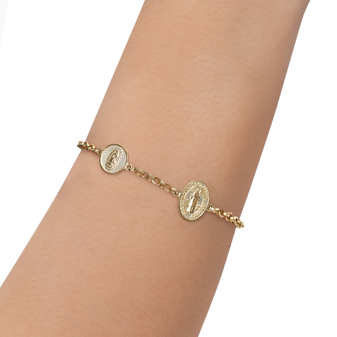 14K YELLOW GOLD VIRGEN MARIA + SAN BENITO ROLO BRACELET