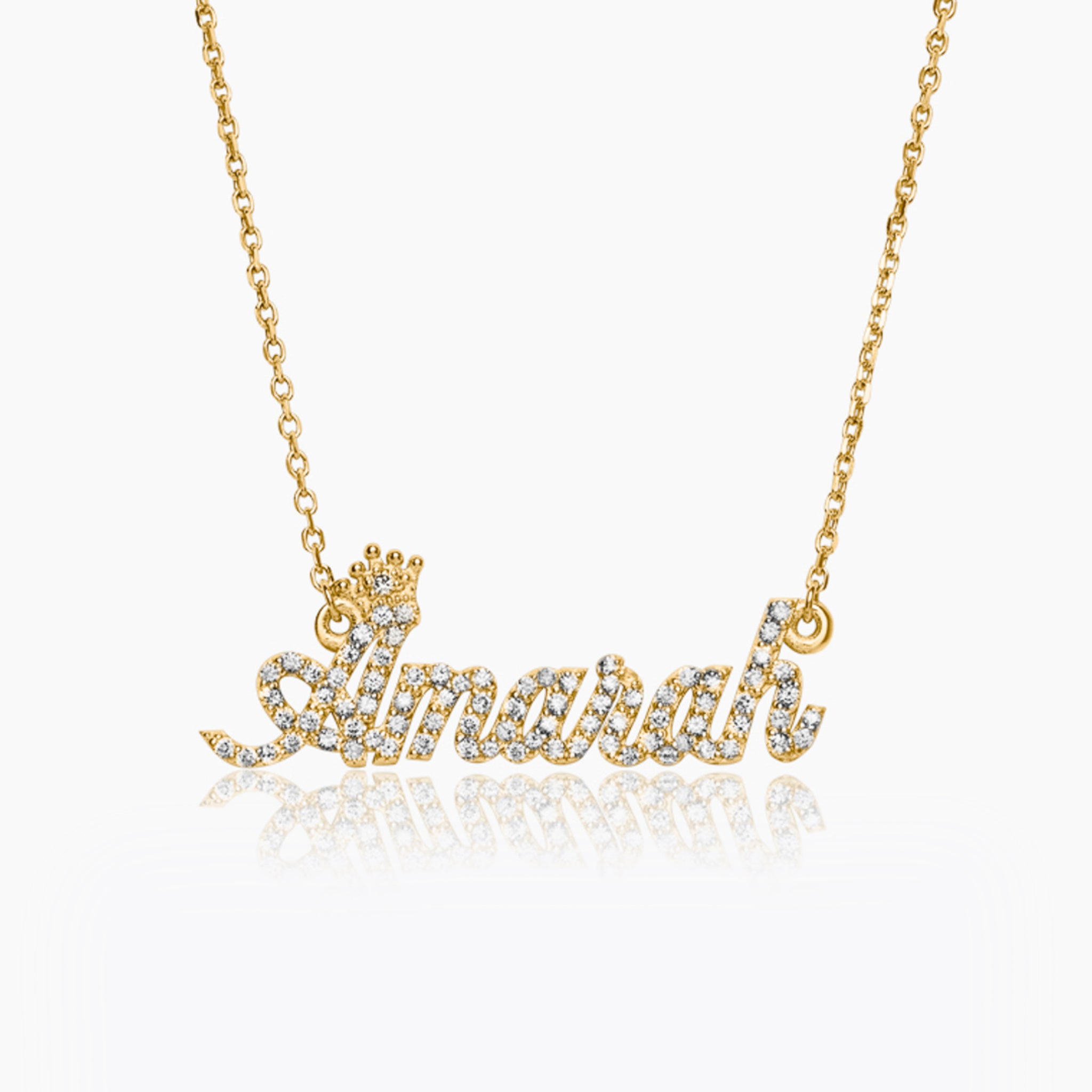14K YELLOW GOLD CROWNED ICY MINI SCRIPT NAME NECKLACE -CZ