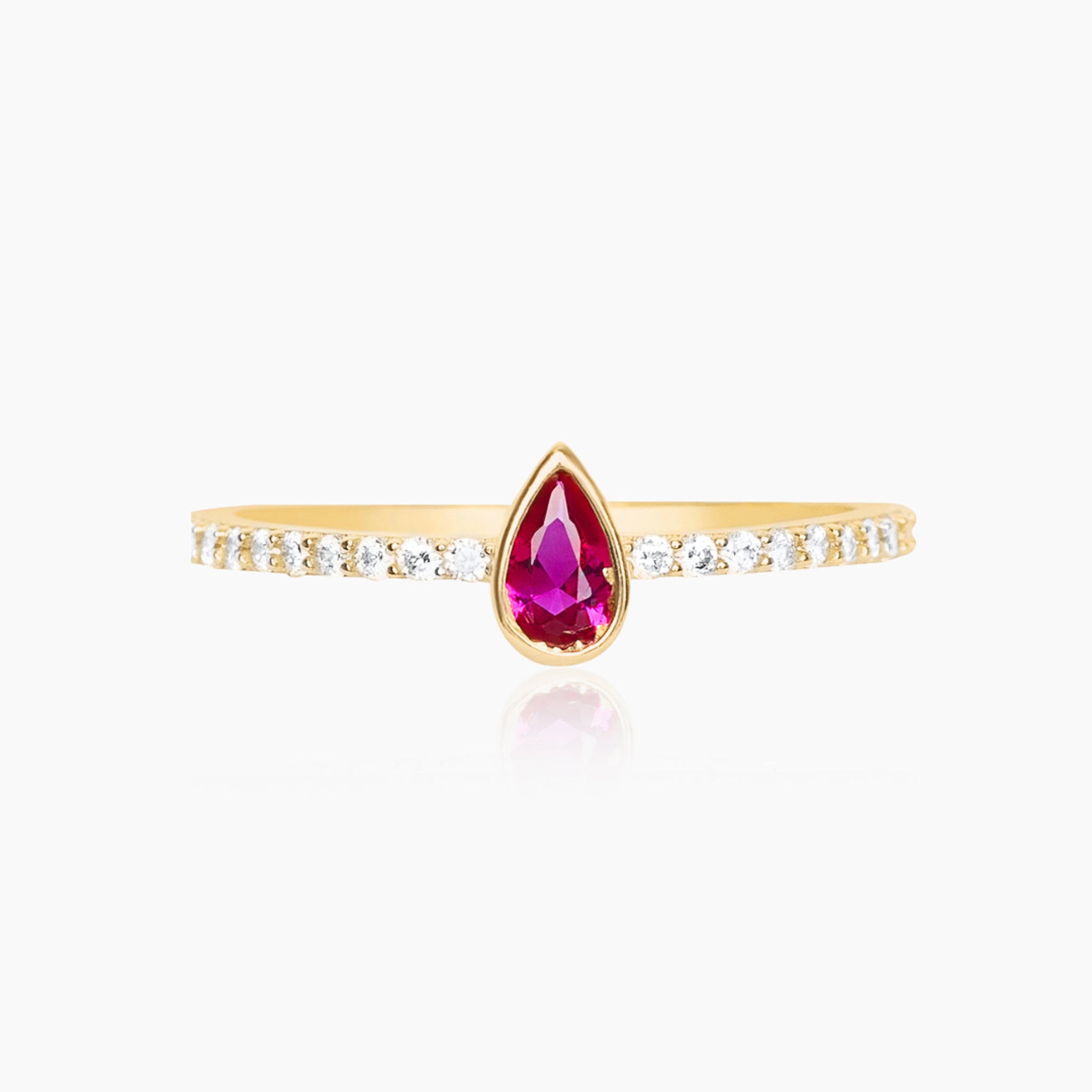 14K YELLOW GOLD PAVE BEZEL PEAR RING -RED