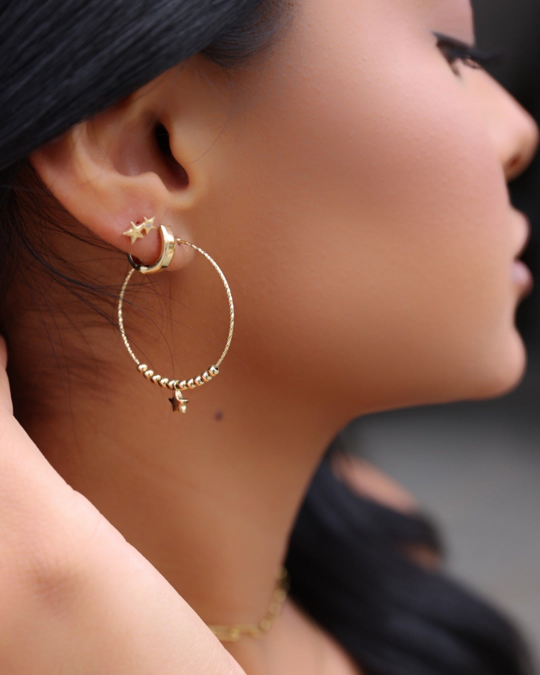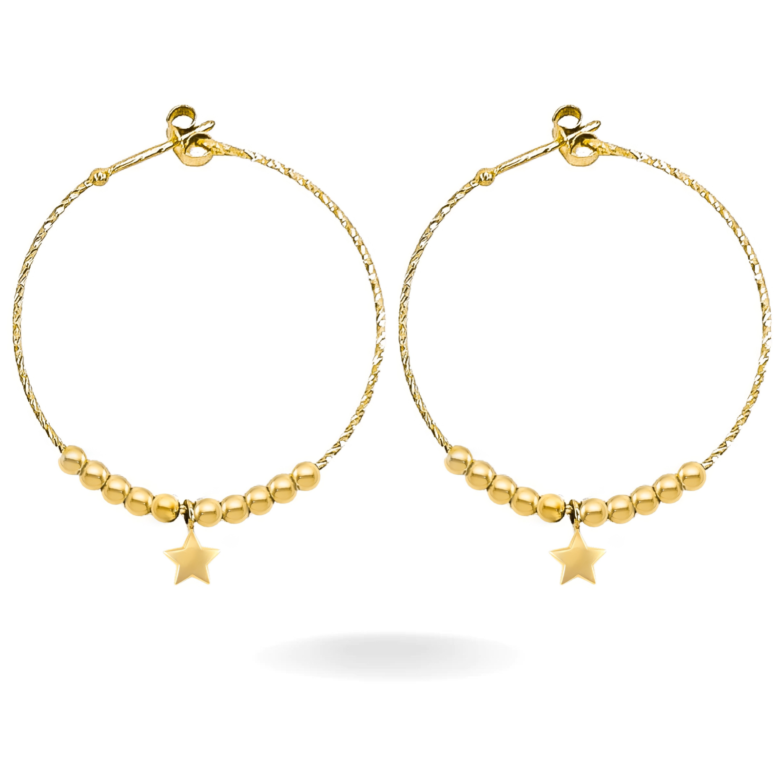 14K YELLOW GOLD DIAMOND CUT BEADED STAR DROP HOOPS