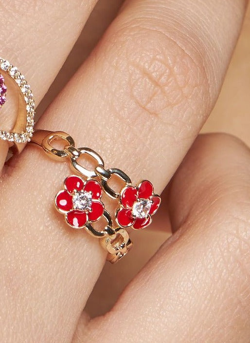 14K YELLOW GOLD RED FLOWER LINK WRAP RING