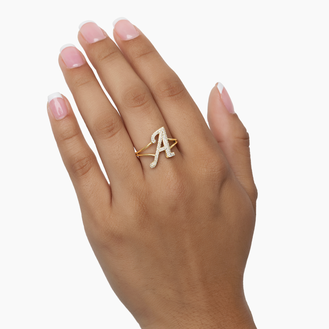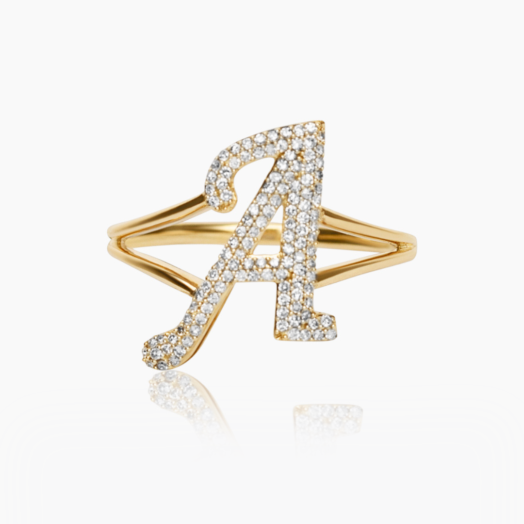 14K YELLOW GOLD DIAMOND INITIAL SPLIT SHANK RING