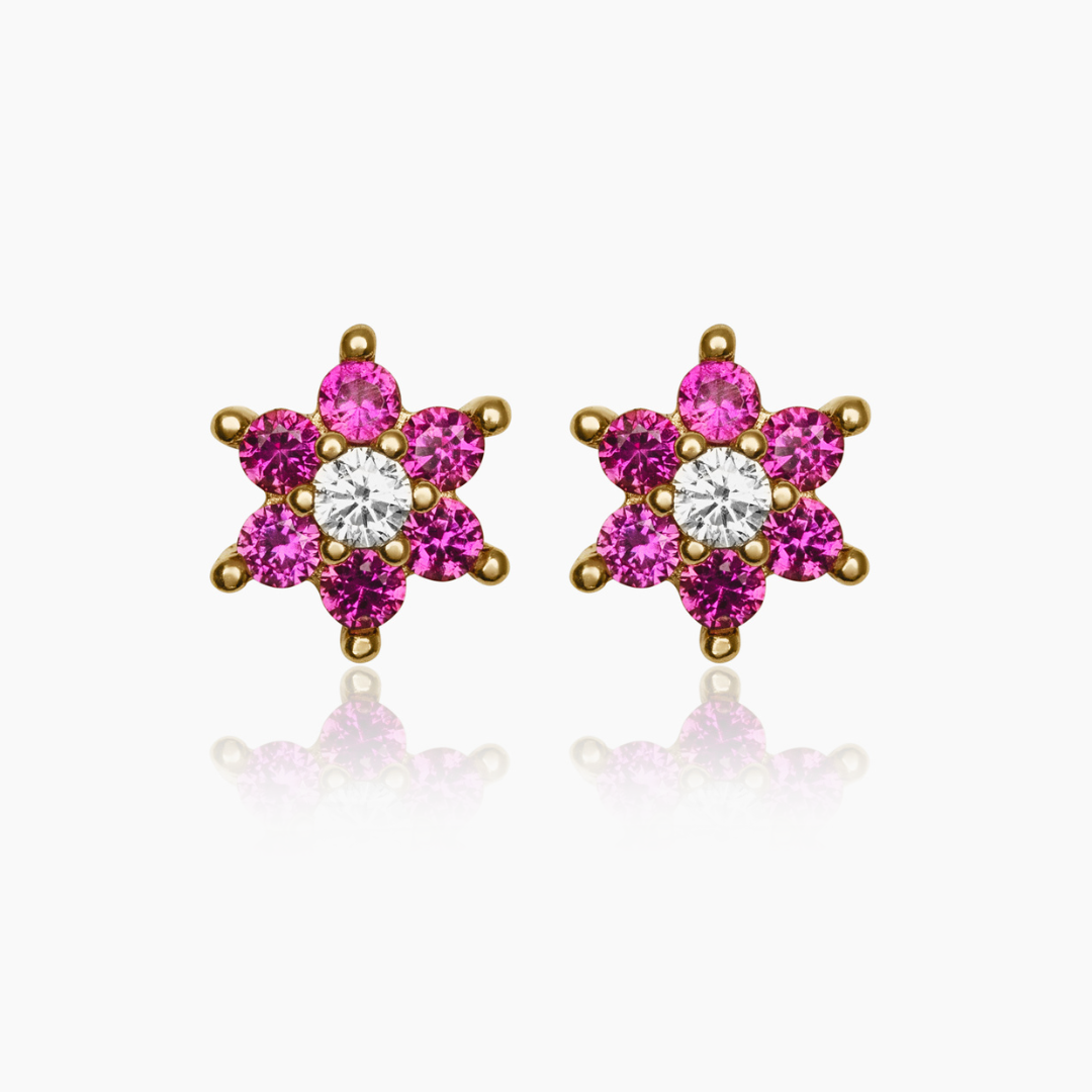 14K YELLOW GOLD FLOWER STUDS -FUCHSIA