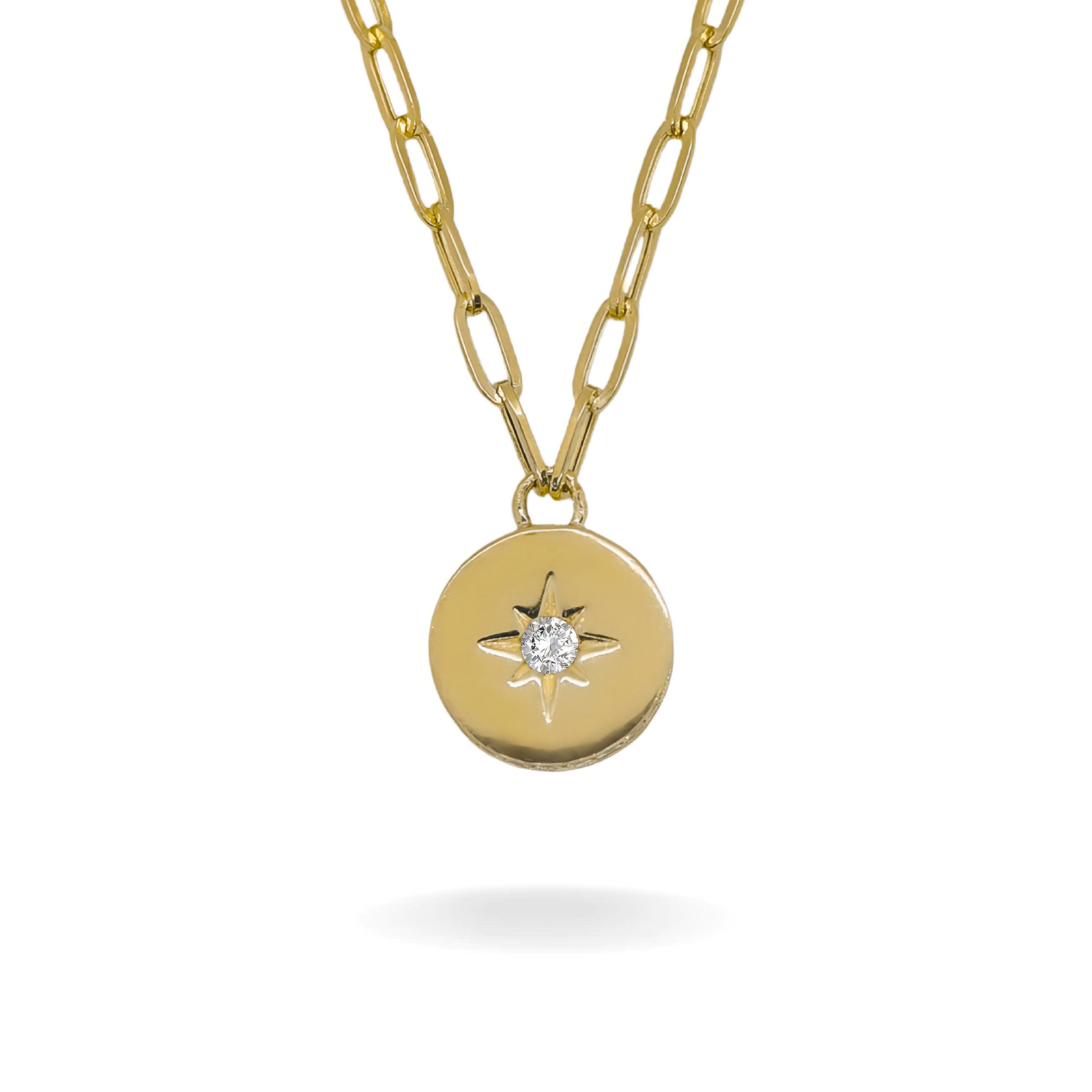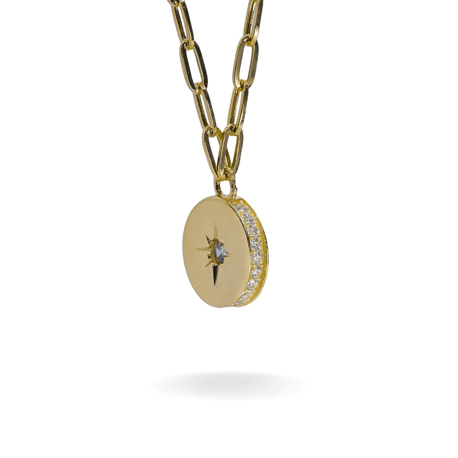 14K YELLOW GOLD STARBURST PAVÉ COIN PAPERCLIP NECKLACE