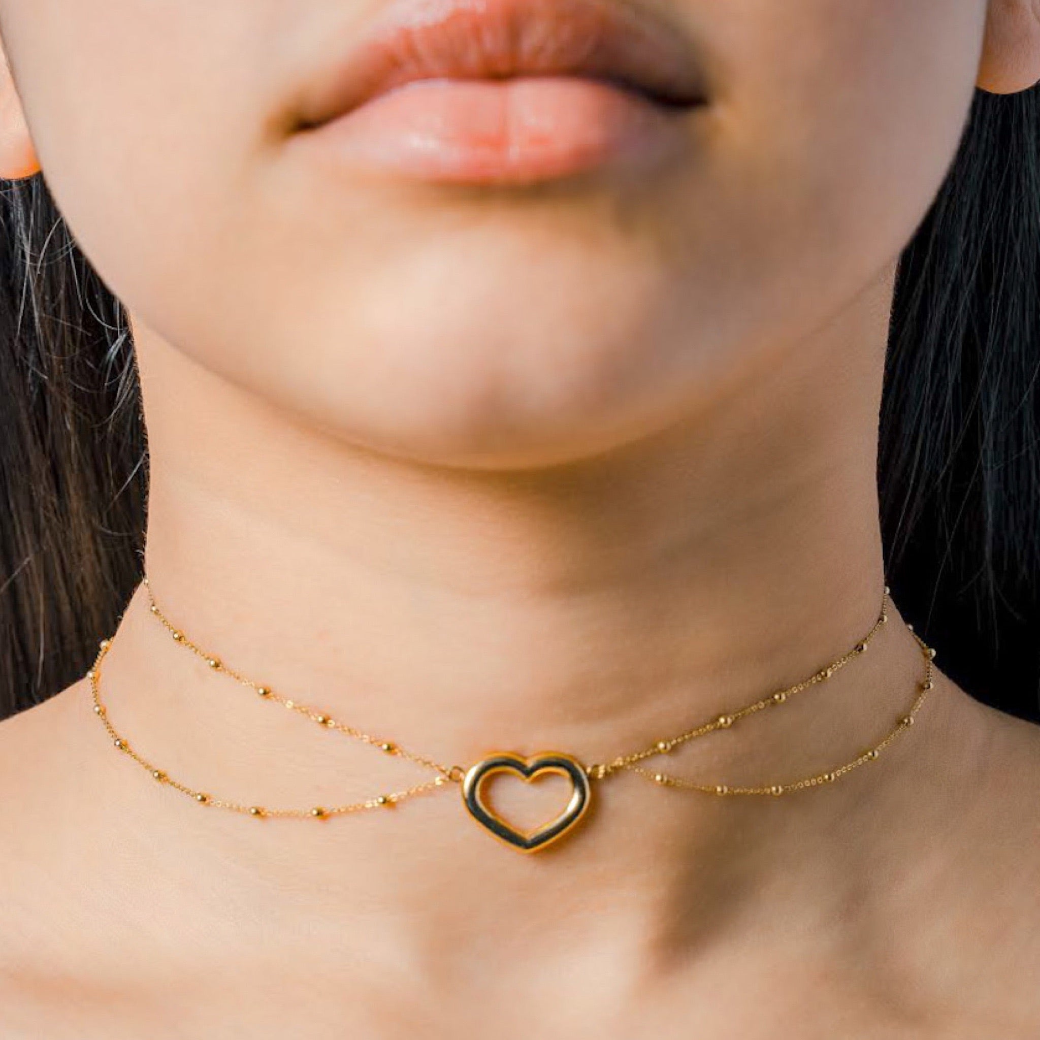 - 10K YELLOW GOLD DRAPED HEART CHOKER NECKLACE