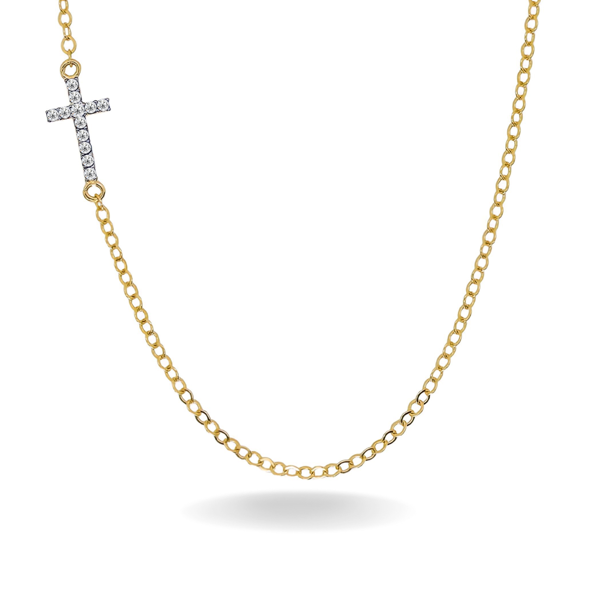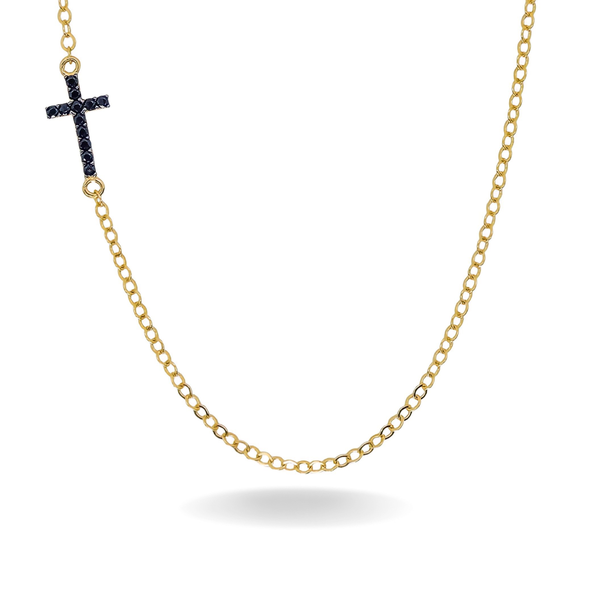 14K YELLOW GOLD DOUBLE SIDED PAVE SIDEWAYS CROSS NECKLACE
