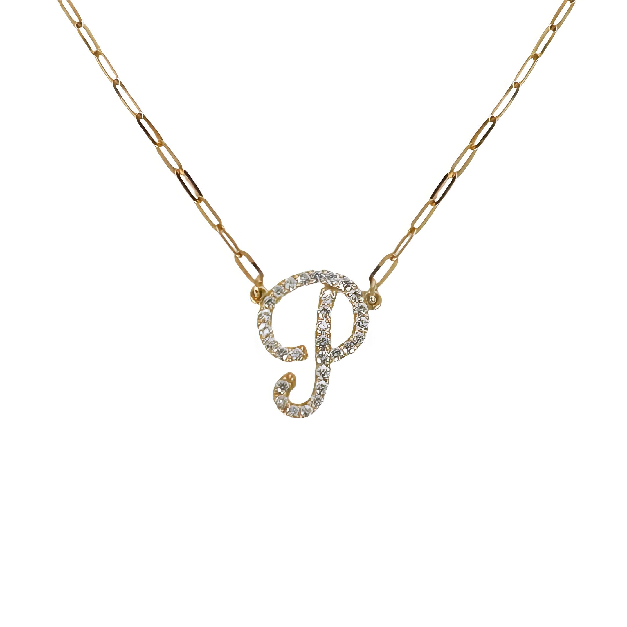 14K YELLOW GOLD DIAMOND SCRIPT INITIAL PAPERCLIP NECKLACE