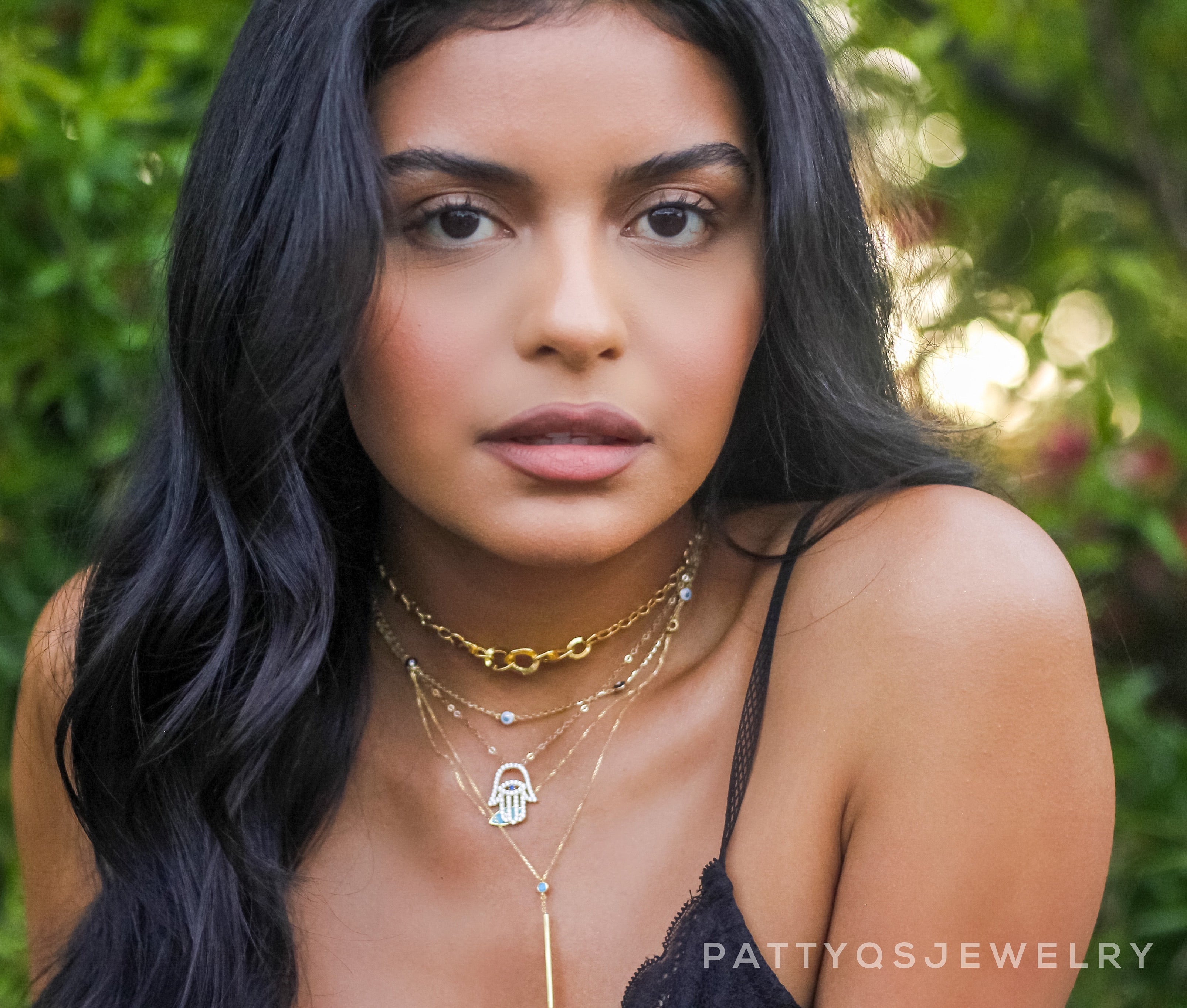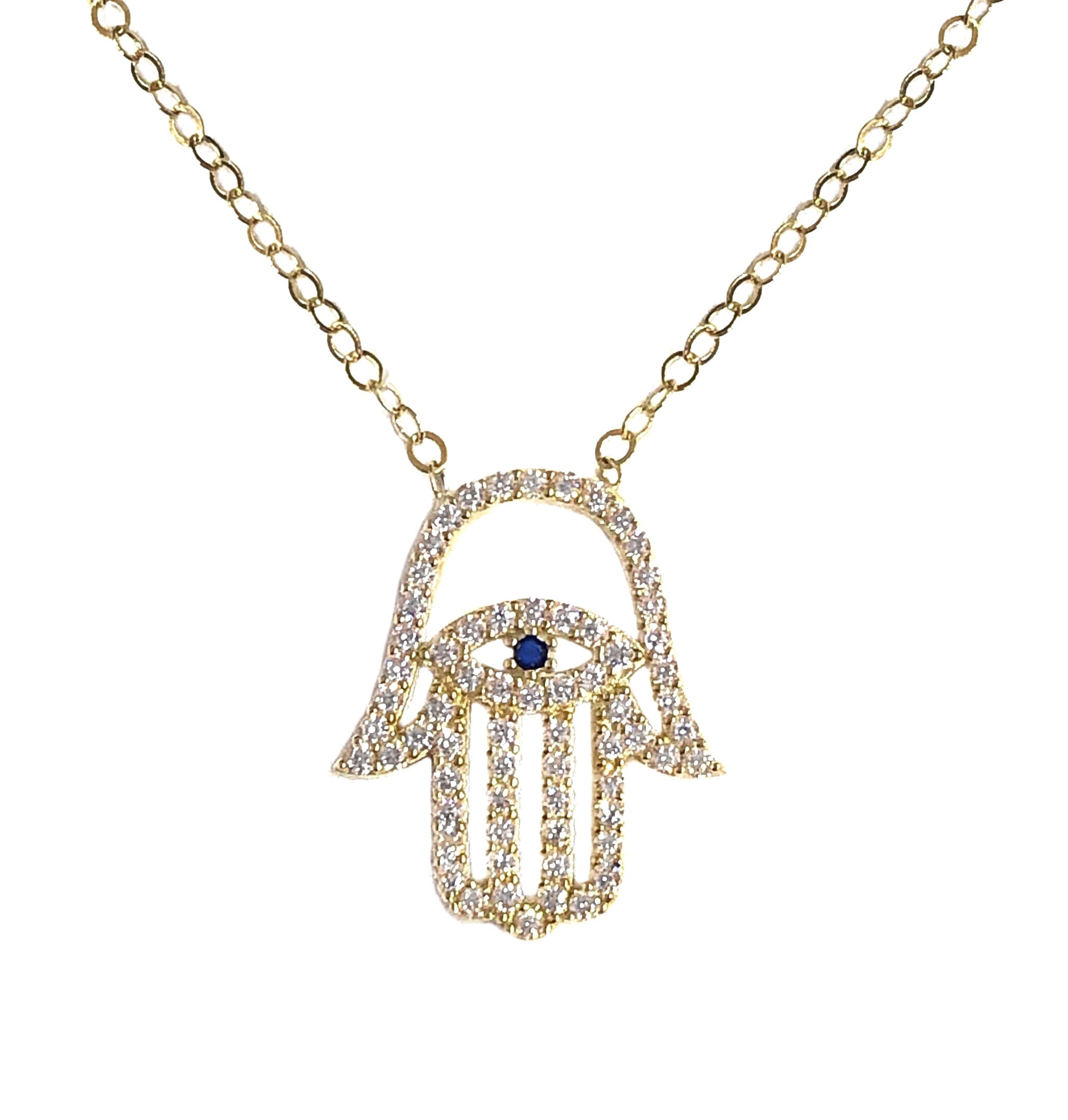 14K YELLOW GOLD PAVE HAMSA BLUE EYE NECKLACE