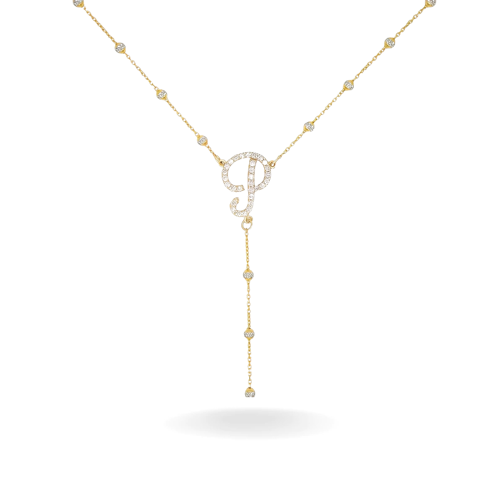 14K TWO TONED GOLD TWINKLE BEADS DIAMOND SCRIPT INITIAL BODY CHAIN