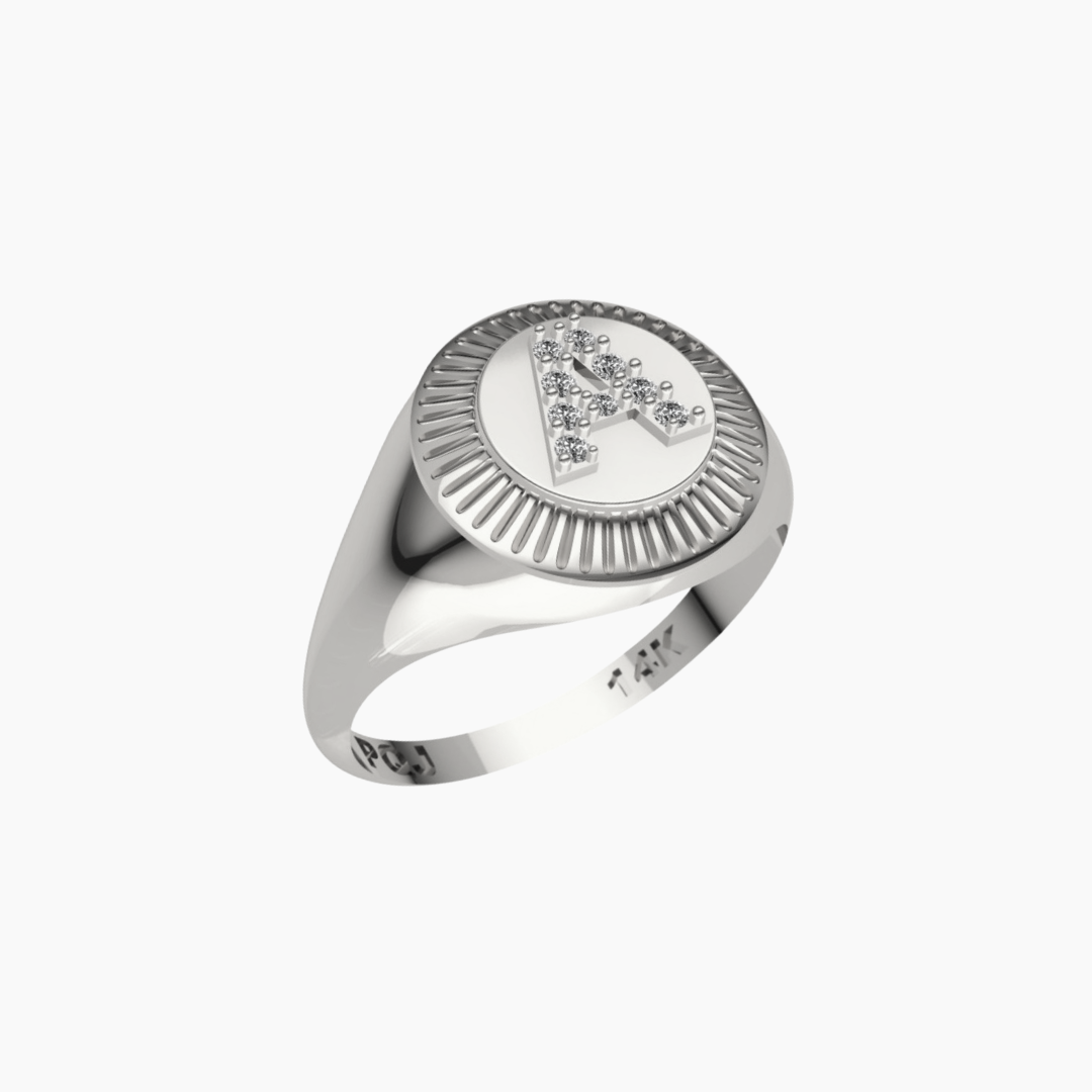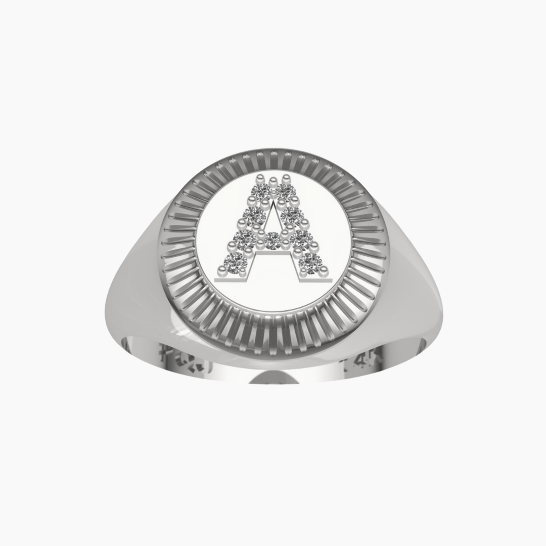 14K WHITE GOLD ROUND AURA DIAMOND INITIAL SIGNET RING
