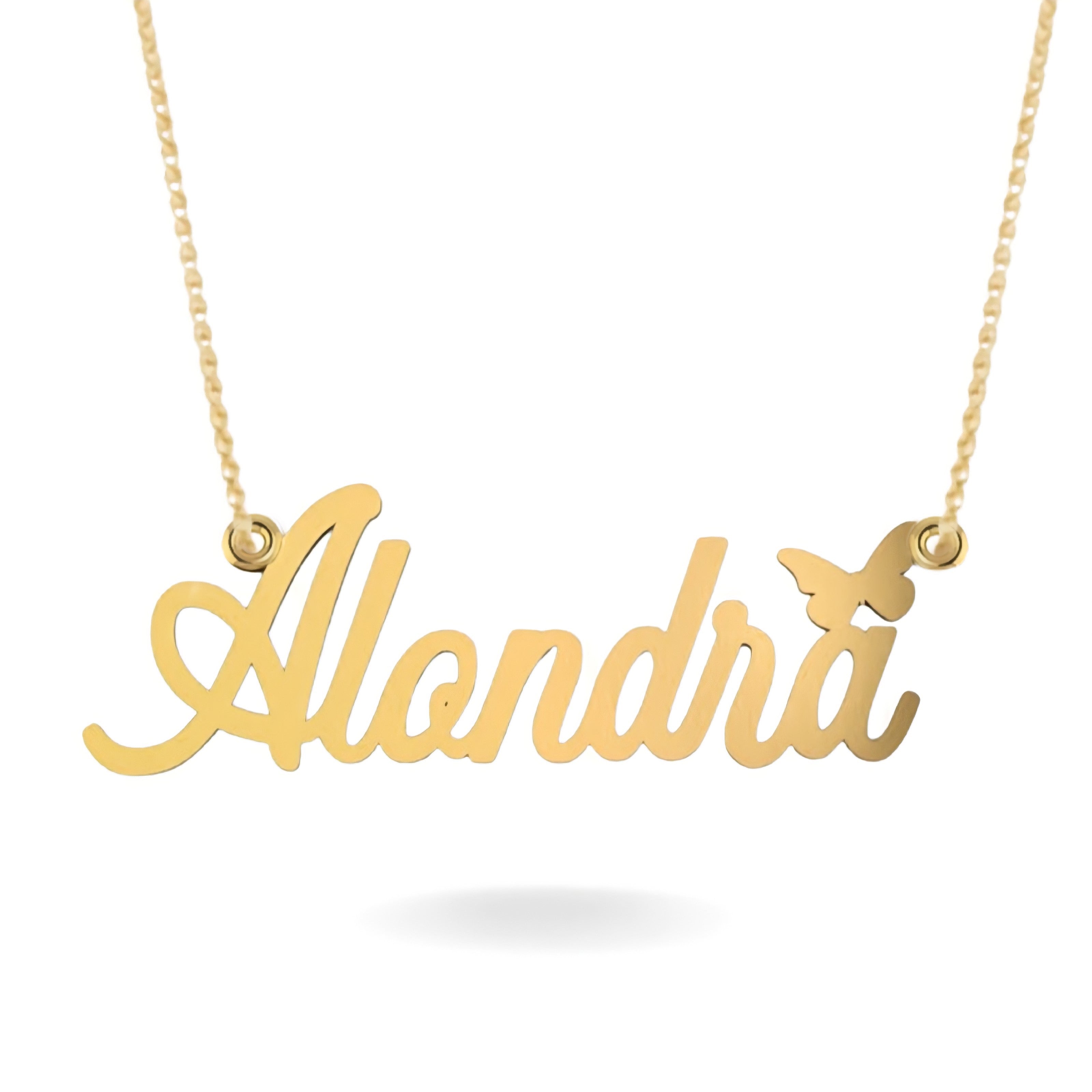14K YELLOW GOLD SCRIPT BUTTERFLY KISS FLOATING NAME NECKLACE