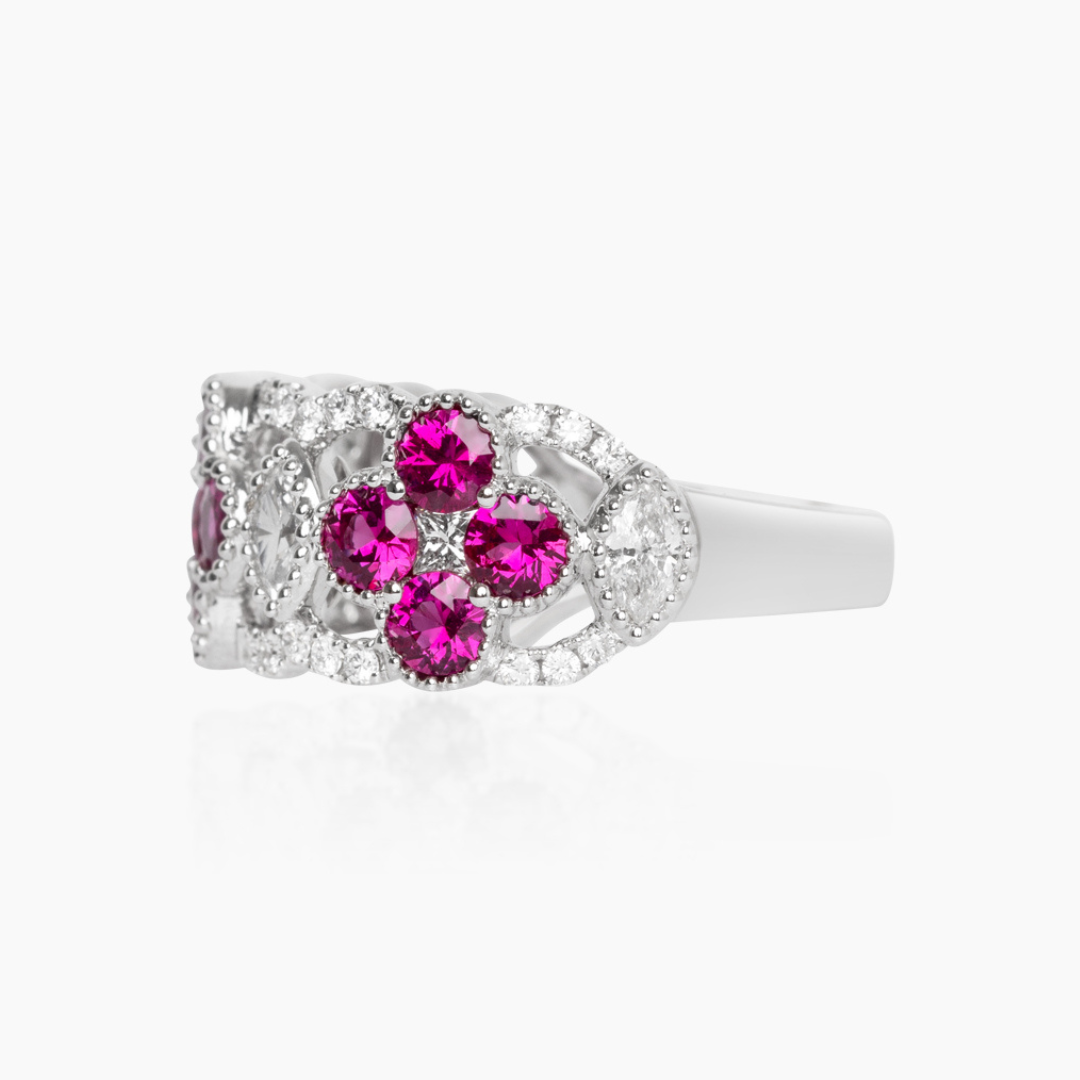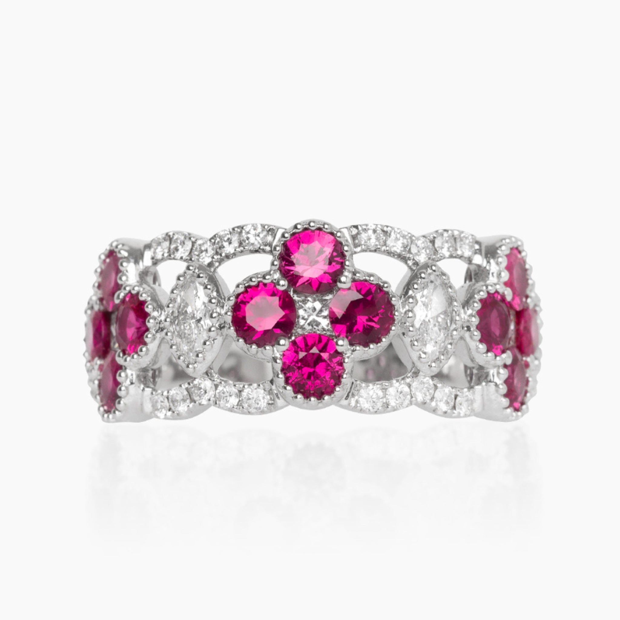 18K WHITE GOLD VIVIENNE CLOVER DIAMOND AND RUBY RING